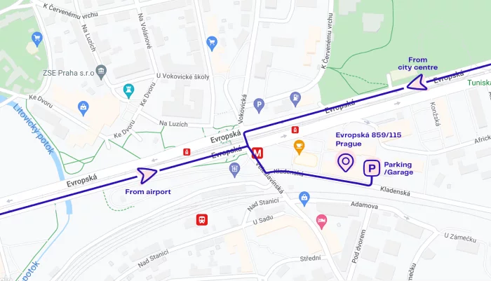 Pokud přijíždíte autem, oznamte nám to prosím alespoň s denním předstihem, abychom vám mohli zajistit bezplatné parkování. Vjezd do našich garáží je z ulice Kladenská. Využijte prosím volná parkovací místa v poschodí P2 (za závorou vpravo na žluté zóně). Pro majitele elektromobilů jsou zde k dispozici 4 nabíjecí místa.